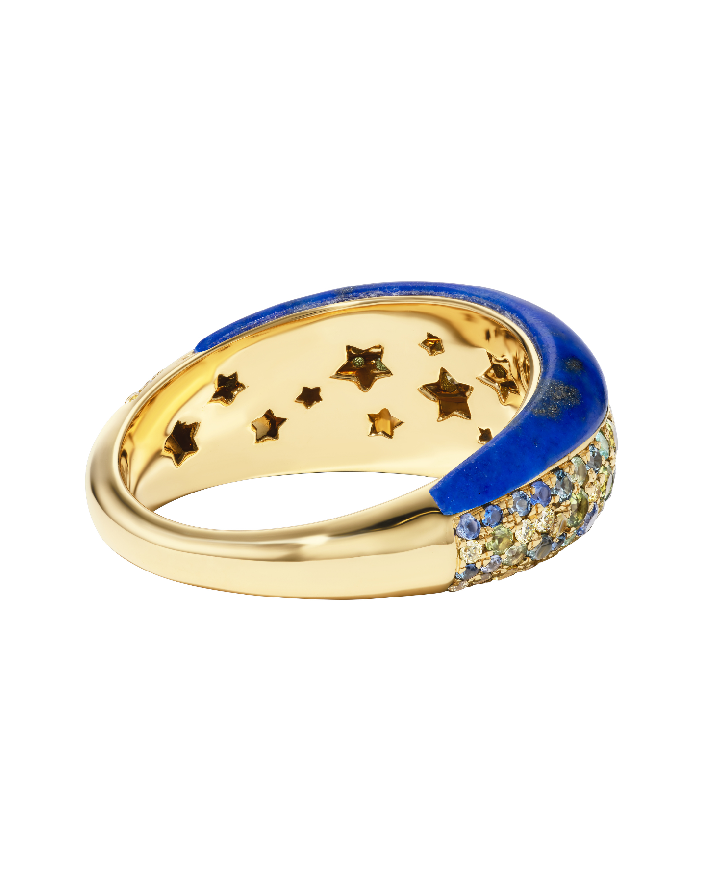 18 karat yellow gold ring with lapis lazuli and pave of sapphires, Paraiba tourmaline, yellow and green natural diamonds